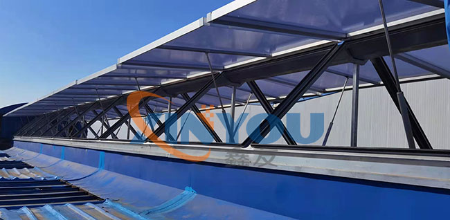 鑫友承接中車唐山8列動(dòng)車組涂裝廠房電動(dòng)采光排煙天窗的設(shè)備供應(yīng)及安裝工程,天窗選擇鋁合金電動(dòng)三角形采光排煙天窗,配置螺桿式開窗機(jī),消防聯(lián)動(dòng)控制箱。